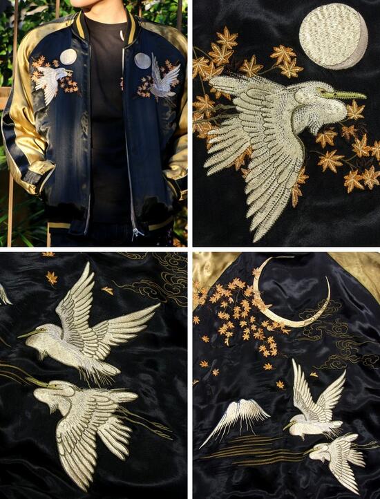SSJ-512 紅葉と鷺リバーシブルスカジャン ●商品詳細 ブランド:花旅楽団 商品名:紅葉と鷺リバーシブルスカジャン 品番:SSJ-512 カラー:ブラック サイズ:S・M・L・XL・XXL 素材:表:レーヨン100%、裏:ポリエステル100% 前面:刺繍 背面:刺繍 ※商品の色調に関しては細心の注意を払っておりますが、御覧になられる環境によって差異がございます。