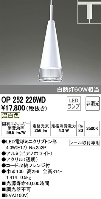 【最安値挑戦中!最大25倍】オーデリック OP252226WD ペンダントライト LEDランプ 非調光 温白色 プラグタイプ レール取付専用 ピアノホワイト [(^^)]